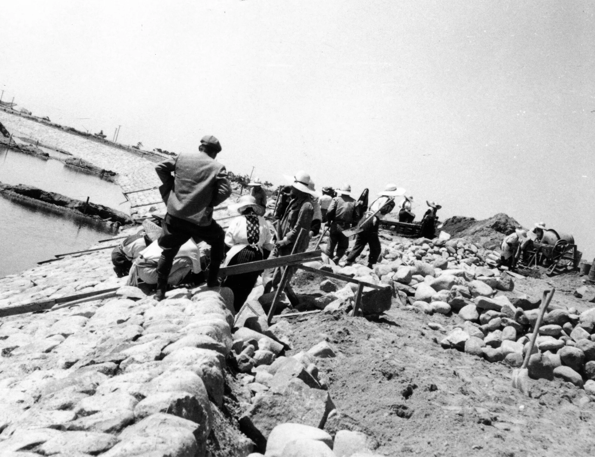 ブルドーザーや杭打機といった重機が次々に導入されはじめた。