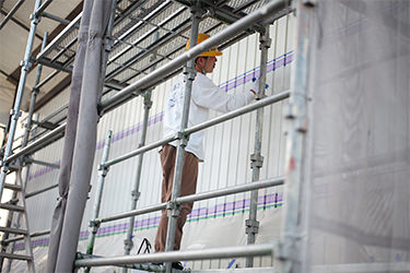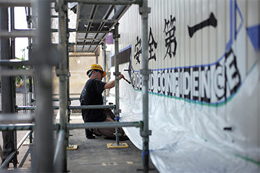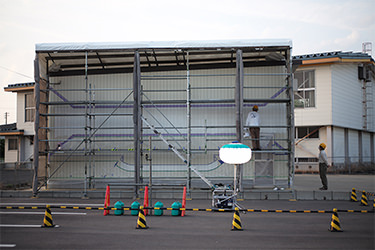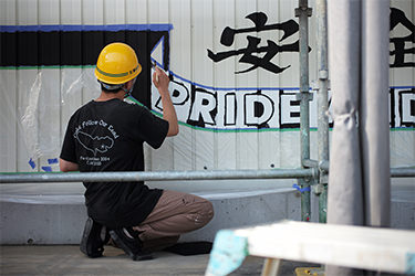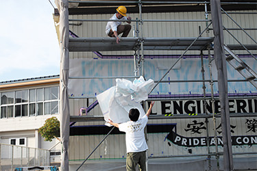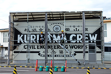 サインペイントをする際の足場設置は協力業者の足場屋にお願いして、ペイントは栗山組社員や自分も手伝う事もありました。経過や完成時にはフォトグラファーの友人が写真を撮ってくれたり、同時期に出張に来て頂いた本ウェブサイト製作者のNATSWORKS 原田さんにも動画撮影を行ってもらったりと、皆んなの協力を得て作り上げる事ができました。本当に感謝しています。