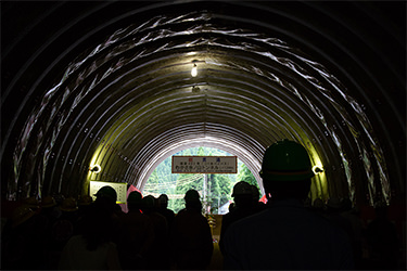 初めに、トンネル工事における最後の貫通発破点火装置が準備され、JV職員の号令のもと、発注者、若桜町長、県議会議員にて点火スイッチが押されました。大きな音とともにトンネルが貫通。JV職員にて貫通確認が行われ、精度よく貫通したことが報告されました。会場の段幕が降ろされ、貫通点から光が差し込まれました。