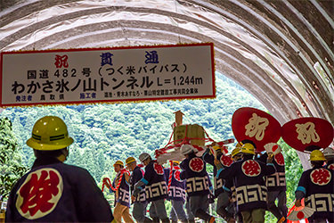 このトンネル貫通式で行われる神輿には歴史があり、古くからの伝統行事です。トンネルの貫通を無事終えた、という坑夫にとっての最高の瞬間でもあります。法被姿で力強く神輿を担ぎ上げ、最後の仕上げを迎え、祝う。その充実感に満ちた職人たちのパワーには本当に圧倒され、心から感動しました。近年は神輿行事を行わない貫通式が多くなりましたが、勇ましく格好良い坑夫の姿を見れるこの瞬間は、後世に残したいと行事だと思いました。
