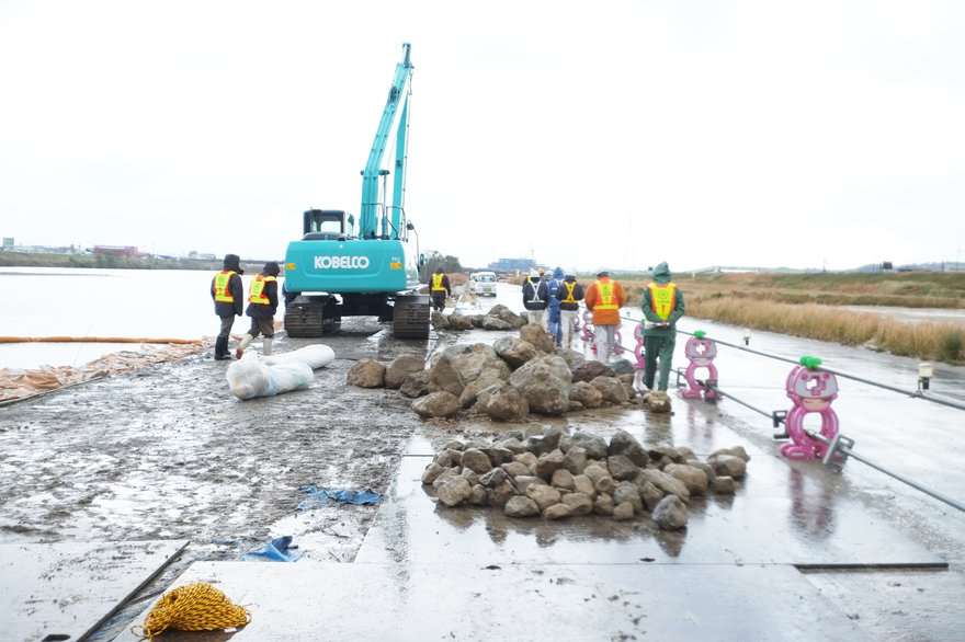 そこへ見学中にも、工事用車両の出入りがあり、また、2大重機のドリルジャンボ(掘る削る)と吹付システム機が実際に稼働しており、臨場感溢れるド迫力でした。重機が入れ替わり立ち替わり山に向かっていく様子を目の当たりにしました。