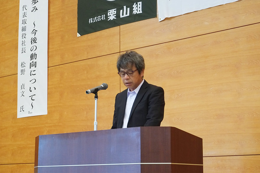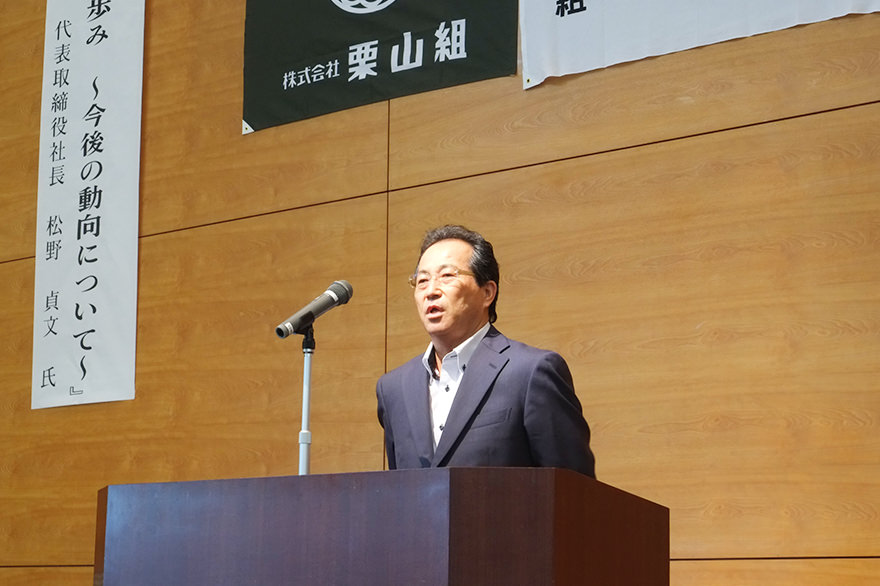 冒頭あいさつに立った栗山社長は「先日の西日本豪雨では各地で大きな災害が発生しました。県内でも各地で被害が発生しましたが、幸いにもこれまでの災害対策事業の積み重ねで大きな被害は避けられたようです。改めて我々が行っている仕事への誇りと自信を、同時に地域社会を守っているという責任を今まで以上に感じました」。